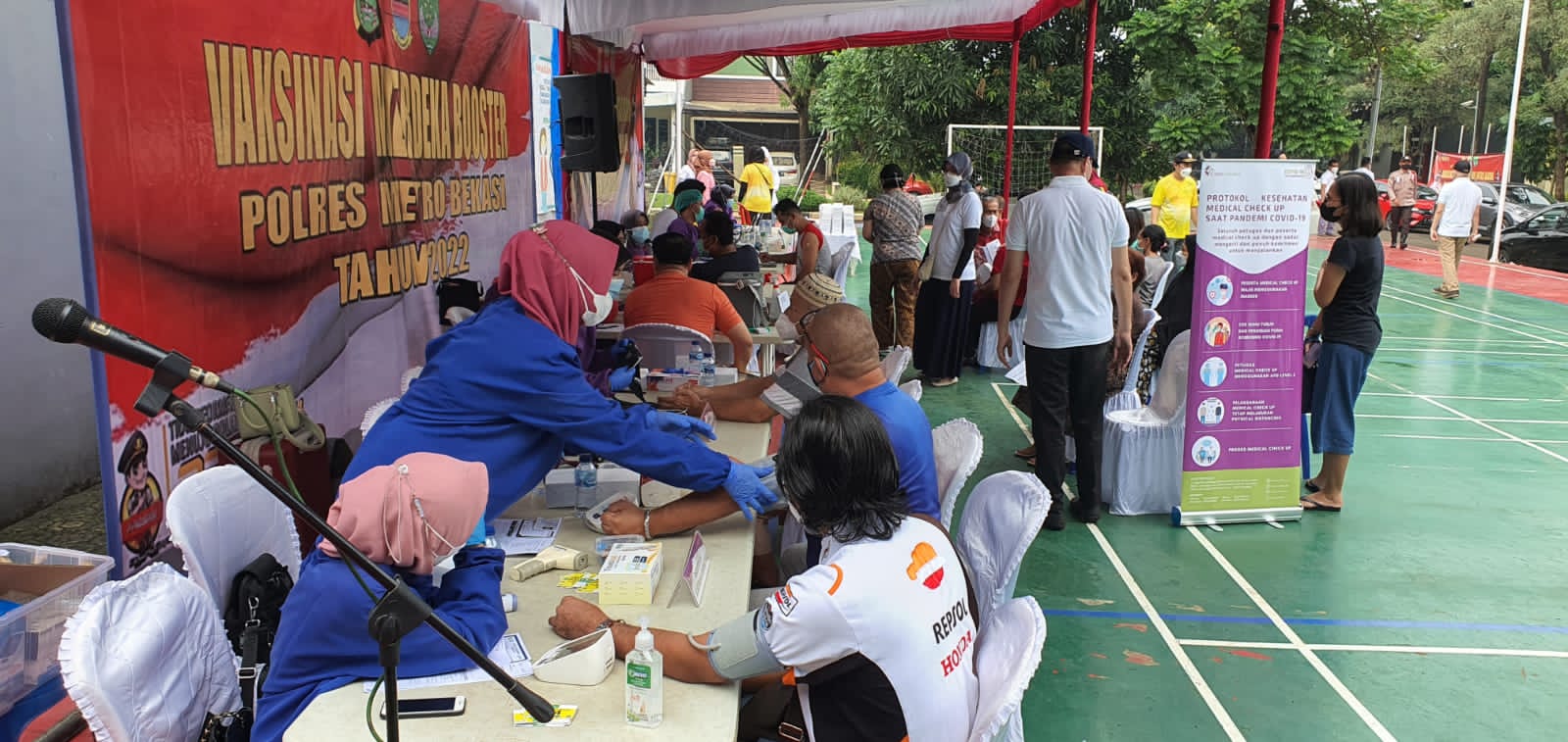 “Hari ini warga penerima vaksin Booster sebanyak 838 orang, dah kami lakukan di dua tempat yaitu di wilayah Grand Wisata dan PT. Pahala Bahari Nusantara,” Jelas Kapolres Metro Bekasi Kombespol Gidion Arif Setiawan