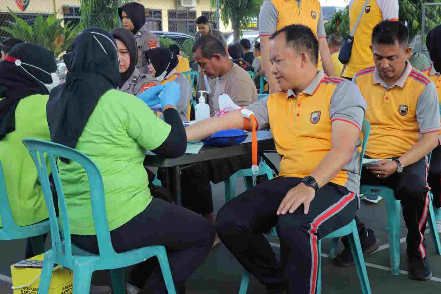 Sebanyak 610 personel dari Polres hingga Polsek jajaran serta para ASN mengikuti pemeriksaan kesehatan yang dilaksanakan di lapangan tenis Mapolres, Jumat 3 Maret 2023.
