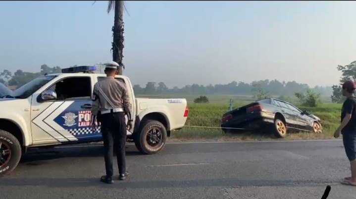 Saat sedang melaksanakan patroli untuk mengawasi arus lalu lintas dan menjaga ketertiban berkendara, sejumlah anggota Satlantas yang melintas di lokasi mendapati sebuah mobil jenis minibus berwarna putih dalam kondisi terperosok ke dalam ledeng (saluran irigasi) di pinggir jalan.