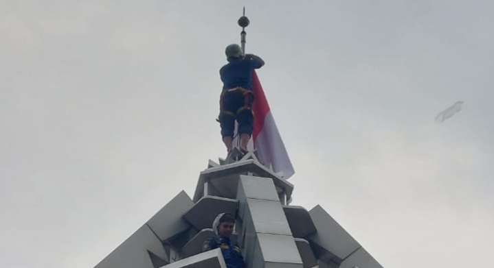 Sesampainya di tugu, para petugas segera melakukan pengamatan medan. Alat-alat panjat disiapkan. Tali, pengait, dan perlengkapan keselamatan dipasang. Dengan ketelitian dan keberanian, satu per satu anggota tim mulai menapaki tubuh tugu yang licin, menantang teriknya matahari dan hembusan angin.