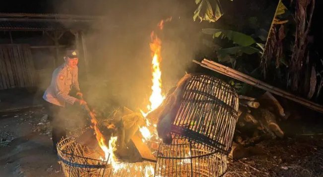 Petugas bersama warga setempat membongkar bangunan tersebut, lalu mengumpulkan sisa kurungan ayam dan material lainnya untuk dibakar.