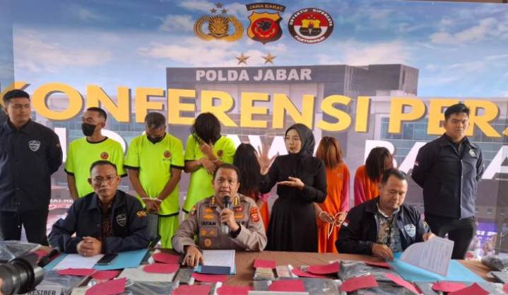 Plh Kabid Humas Polda Jabar Kombes Pol. Irfan N SIK menjelaskan penggerebe kan yang dipimpin Kanit 2 Subdit 2 Siber AKP Idham Chalid, petugas berhasil mengamankan enam tersangka.
