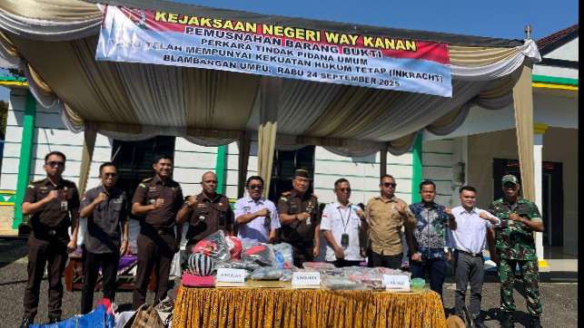 WAY KANAN, L86News.com – Kejaksaan Negeri (Kejari) Way Kanan melakukan pemusnahan barang bukti dari berbagai perkara di halaman kantor Kejari setempat, Rabu (24/9/2025). Kegiatan ini turut dihadiri jajaran Forkopimda Kabupaten Way Kanan.