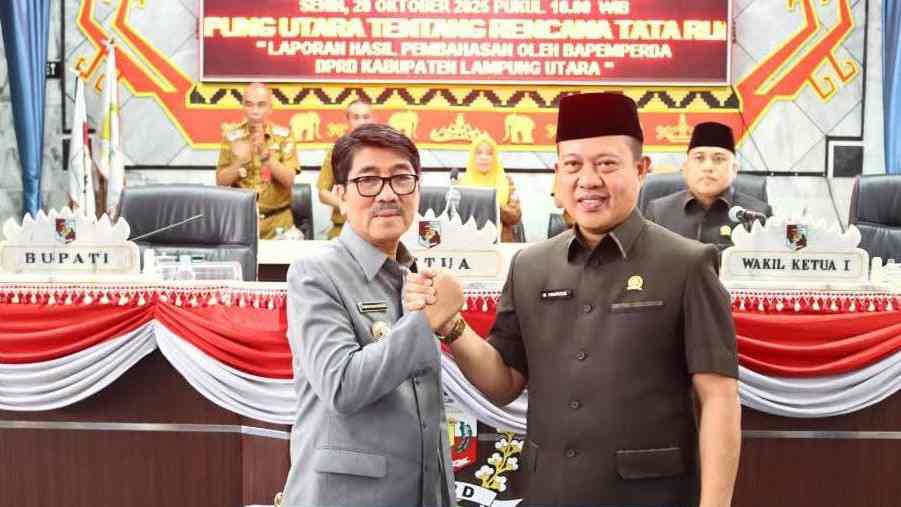 LAMPUNG UTARA, L86News.com – Bupati Lampung Utara, Dr. Ir. Hamartoni Ahadis, M.Si., menghadiri Rapat Paripurna DPRD dalam rangka pembahasan Rancangan Peraturan Daerah tentang Rencana Tata Ruang Wilayah (RTRW) Kabupaten Lampung Utara Tahun 2025–2045, yang digelar hari ini di ruang rapat DPRD Kabupaten Lampung Utara.