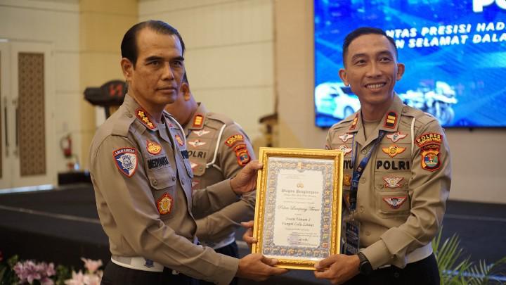 Penghargaan diterima langsung oleh Kasat Lantas Polres Lampung Timur, IPTU Wahyu Dwi Kristanto, yang hadir membawa nama Polres Lampung Timur menjadi salah satu satuan terbaik dalam pelaksanaan tugas dan inovasi pelayanan publik di bidang lalu lintas.