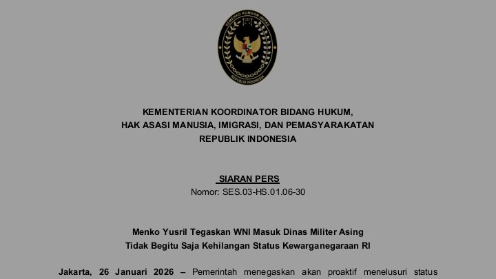 “Pasal 23 Undang-Undang Nomor 12 Tahun 2006 tentang Kewarganegaraan Republik Indonesia memang menyebutkan bahwa WNI kehilangan kewarganegaraannya apabila masuk dalam dinas tentara asing tanpa izin Presiden. Namun kehilangan itu tidak bersifat otomatis,” ujar Menko Yusril melalui keterangan tertulis di Jakarta, Senin (26/1/2026).