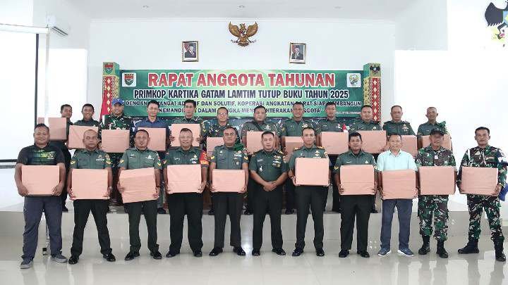 LAMPUNG TIMUR, L86News.com – Rapat Anggota Tahunan (RAT) Primer Koperasi Gatam Lamtim ke-4 yang mengusung tema “Dengan Semangat Adaptif dan Solutif, Koperasi Angkatan Darat Siap Membangun Kemandirian Dalam Rangka Mensejahterakan Anggota” berlangsung di Aula Gatot Subroto, Makodim, Kamis (12/02/2026).