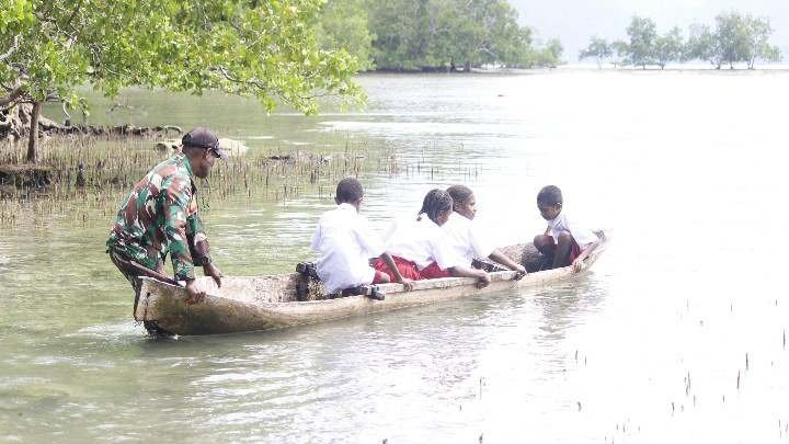 Salah satu personel Satgas TMMD ke-127, Sertu Daniel Ndiken, menunjukkan kepedulian nyata dengan mengantar anak-anak sekolah dari Kampung Marsi menuju Kampung Sisir. Akses pendidikan yang harus ditempuh anak-anak tersebut bukanlah perjalanan biasa. Mereka harus melintasi jalur laut menggunakan perahu atau sampan demi dapat tiba di sekolah dengan selamat.