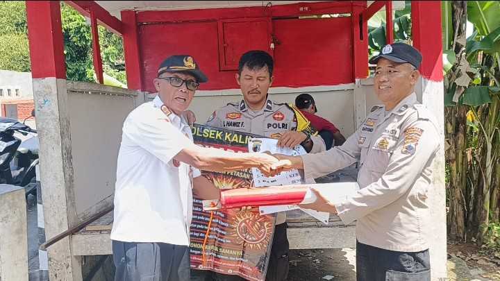 Polsek Kalimanah menyerahkan bantuan berupa dua lembar kalsiboard untuk perbaikan bangunan poskamling, alat kentongan, banner tanda bunyi kentongan dan kalender 2026. Bantuan diterima langsung oleh Kepala Desa Sidakangen, Wagimin, disaksikan perangkat desa dan warga.