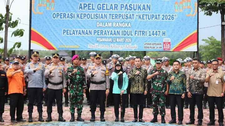 PESAWARAN, L86News.com – Bupati Pesawaran Hj. Nanda Indira B., S.E., M.M. memimpin Apel Gelar Pasukan Operasi Kepolisian Terpusat “Ketupat Krakatau 2026” dalam rangka pengamanan dan pelayanan perayaan Hari Raya Idul Fitri 1447 Hijriah. Apel tersebut digelar di halaman Mapolres Pesawaran, Kamis (12/3/2026).