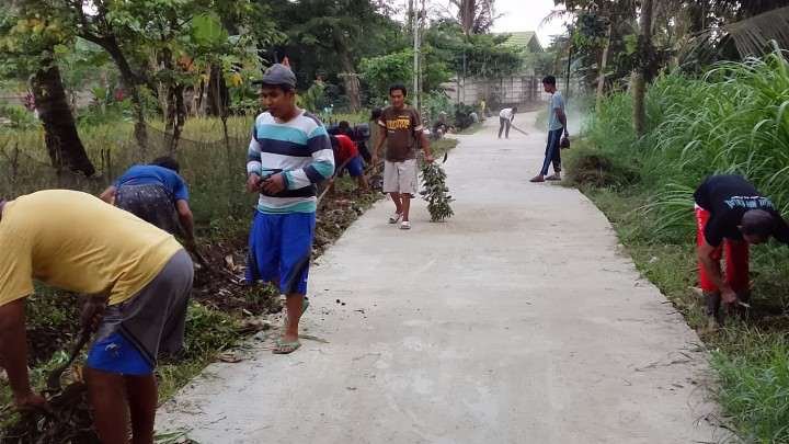 Gotong royong dengan cara membersihkan rumput liar, sampah dan ranting pohon di sepanjang ruas jalan serta drainase dusun setempat itu di lakukan untuk menjaga kebersihan lingkungan dan mengantisifasi terjadinya banjir.