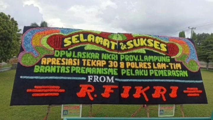 Karangan bunga tersebut berisi ucapan selamat dan apresiasi atas keberhasilan Polres Lampung Timur dalam Operasi Tangkap Tangan (OTT) terhadap Ketua LSM yang di duga terlibat praktik pemerasan.