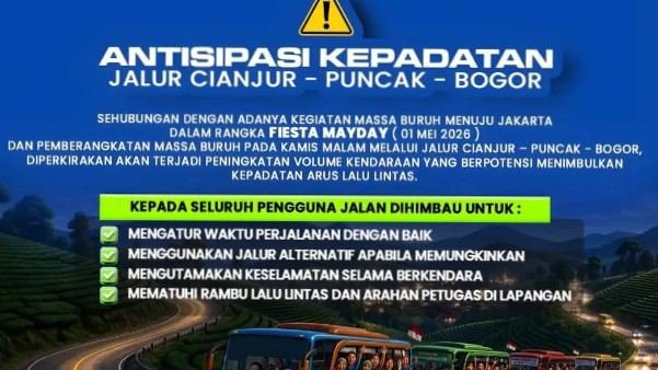 CIANJUR, L86News.com — Dalam rangka mengantisipasi potensi kepadatan arus lalu lintas di jalur Cianjur – Puncak – Bogor saat ada pergerakan massa buruh menuju Jakarta dalam rangka kegiatan Fiesta Mayday pada 1 Mei 2026, di perkirakan akan terjadi peningkatan volume kendaraan di sejumlah titik.